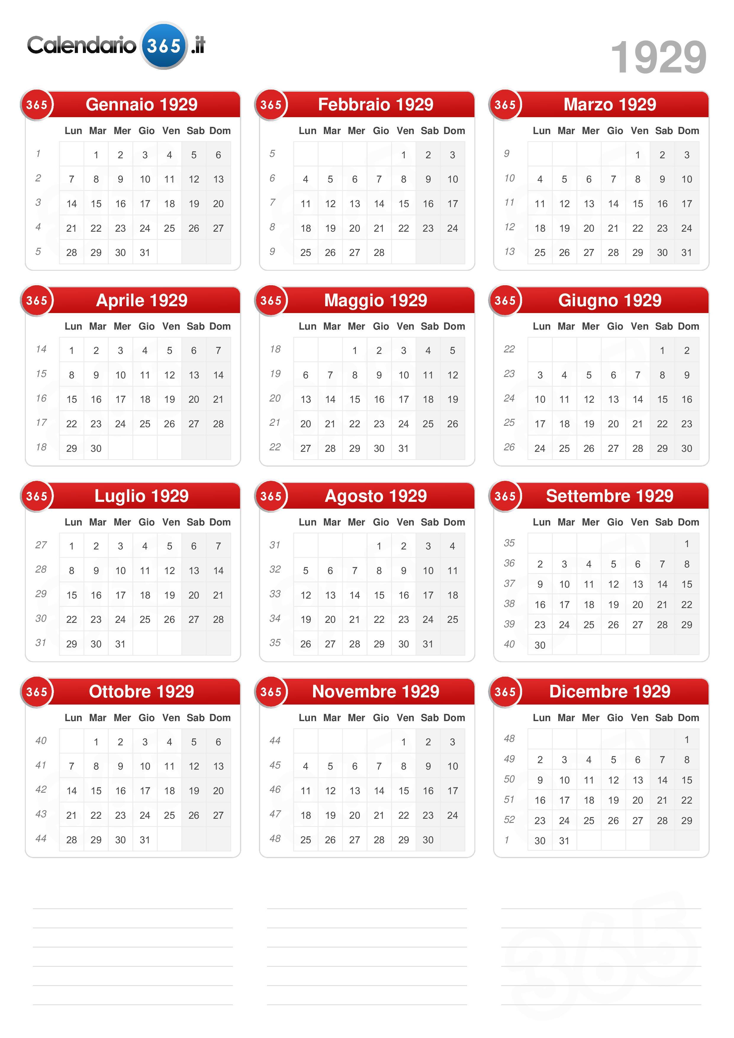 Il calendario 1929 viene generato automaticamente ed è sempre consultabile online. Anche i calendari mensili nel 1929, incluso i numeri delle settimane, si possono visualizzare cliccando, qui sopra, su uno dei mesi. Mediante il menù, all’inizio di questa pagina, si possono inoltre visualizzare gli anni bisestili, l’orario legale e l’orario invernale, la posizione attuale della Luna nel 1929, il calendario lunare 1929 e gli orologi dei fusi orari.Vedi anche la Calendario 1930.