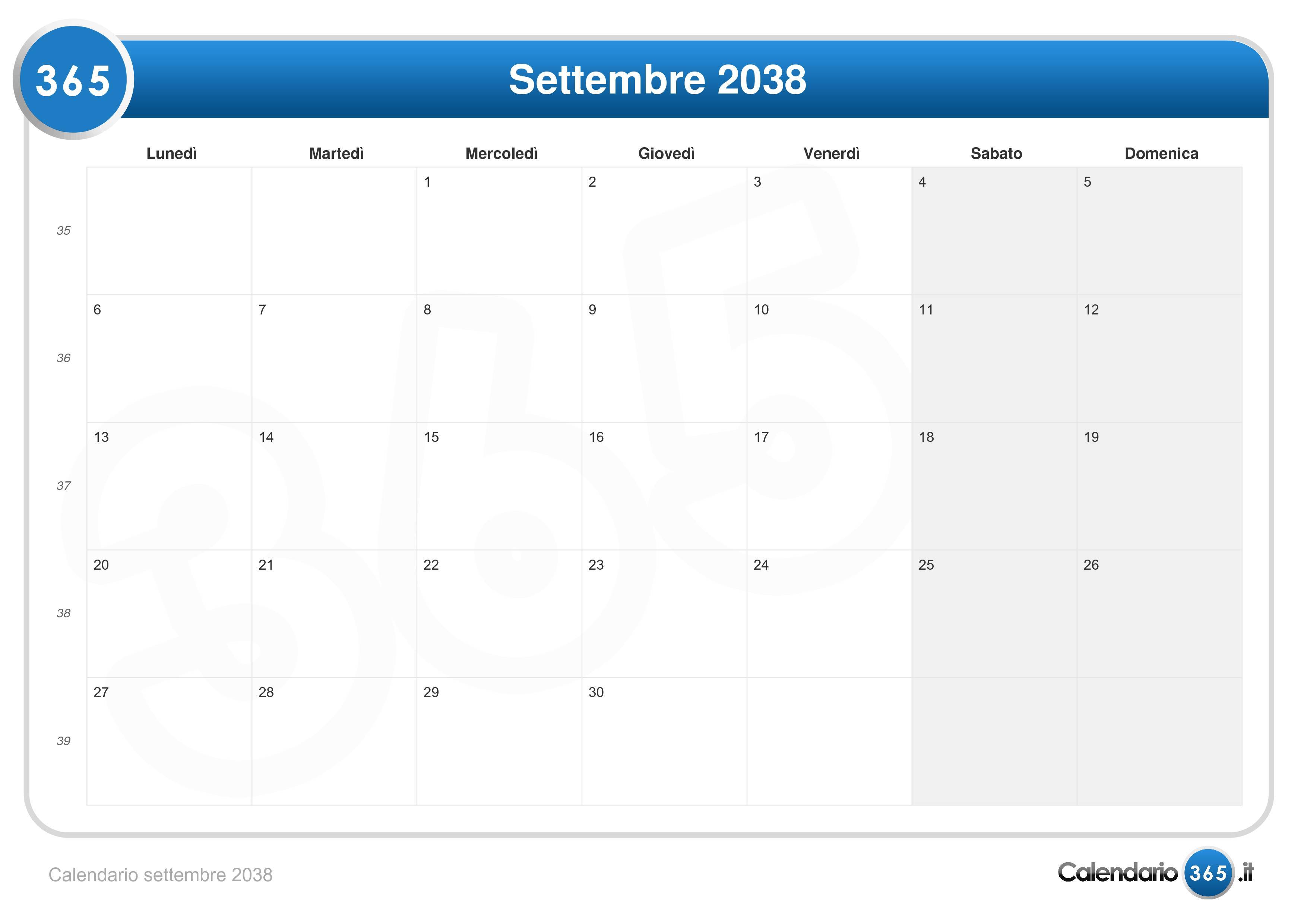 Calendario settembre 2038 (Formato orizzontale)Vai al Calendario 2038.