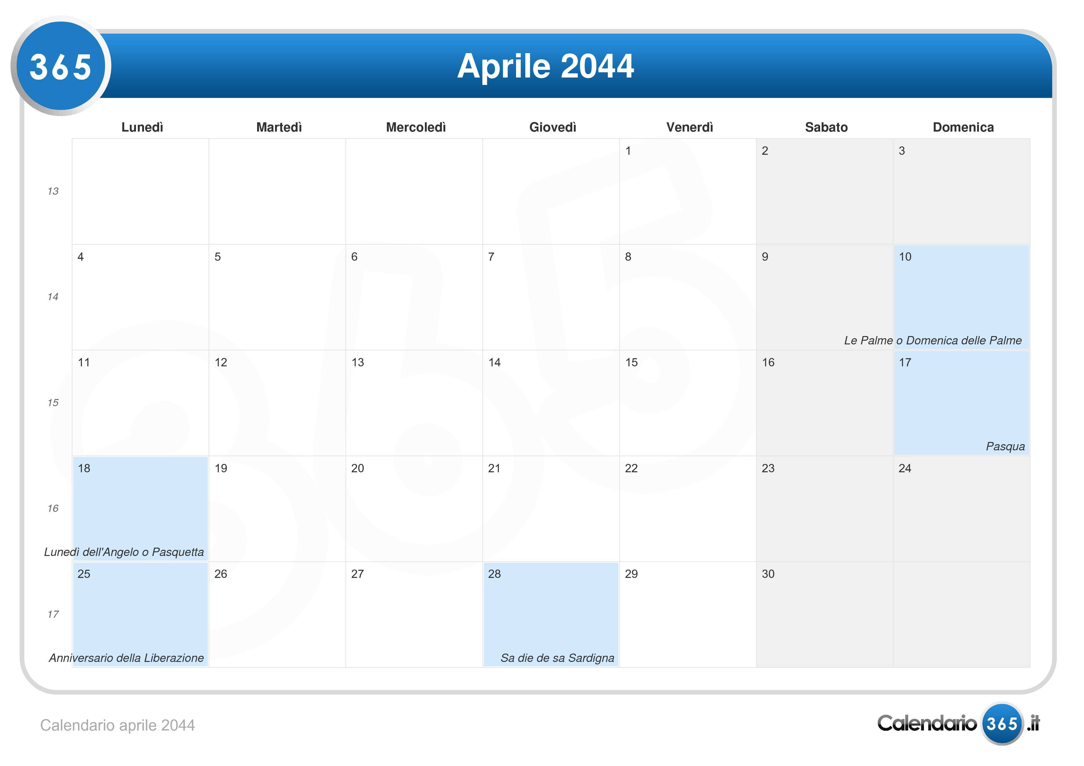 Calendario aprile 2044 (Formato orizzontale)Vai al Calendario 2044.