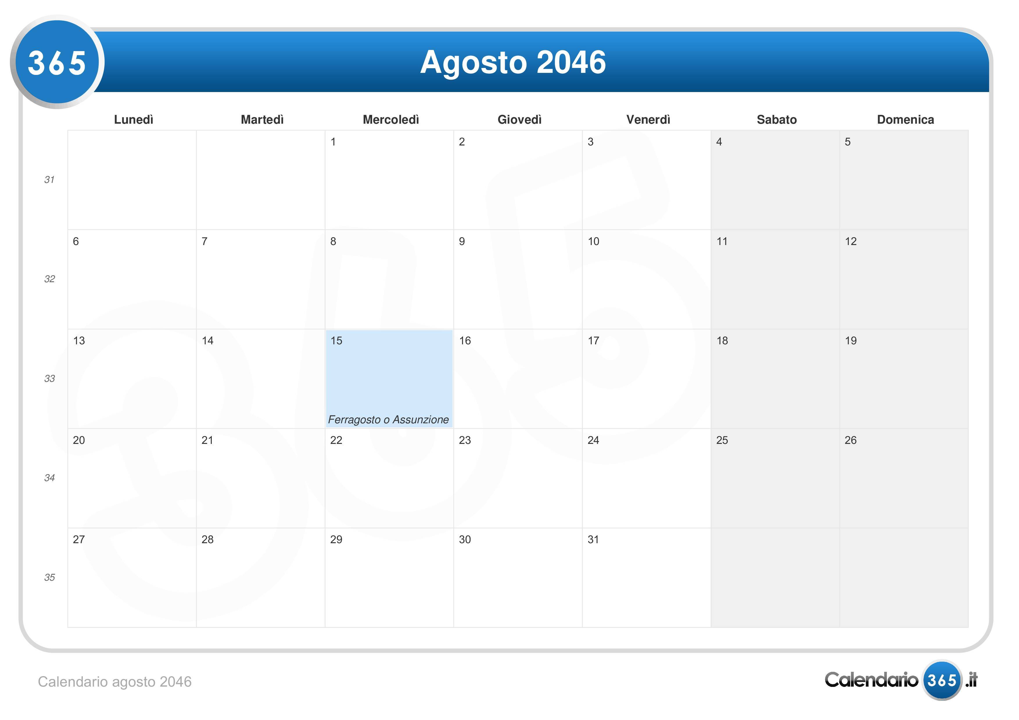 Calendario agosto 2046 (Formato orizzontale)Vai al Calendario 2046.