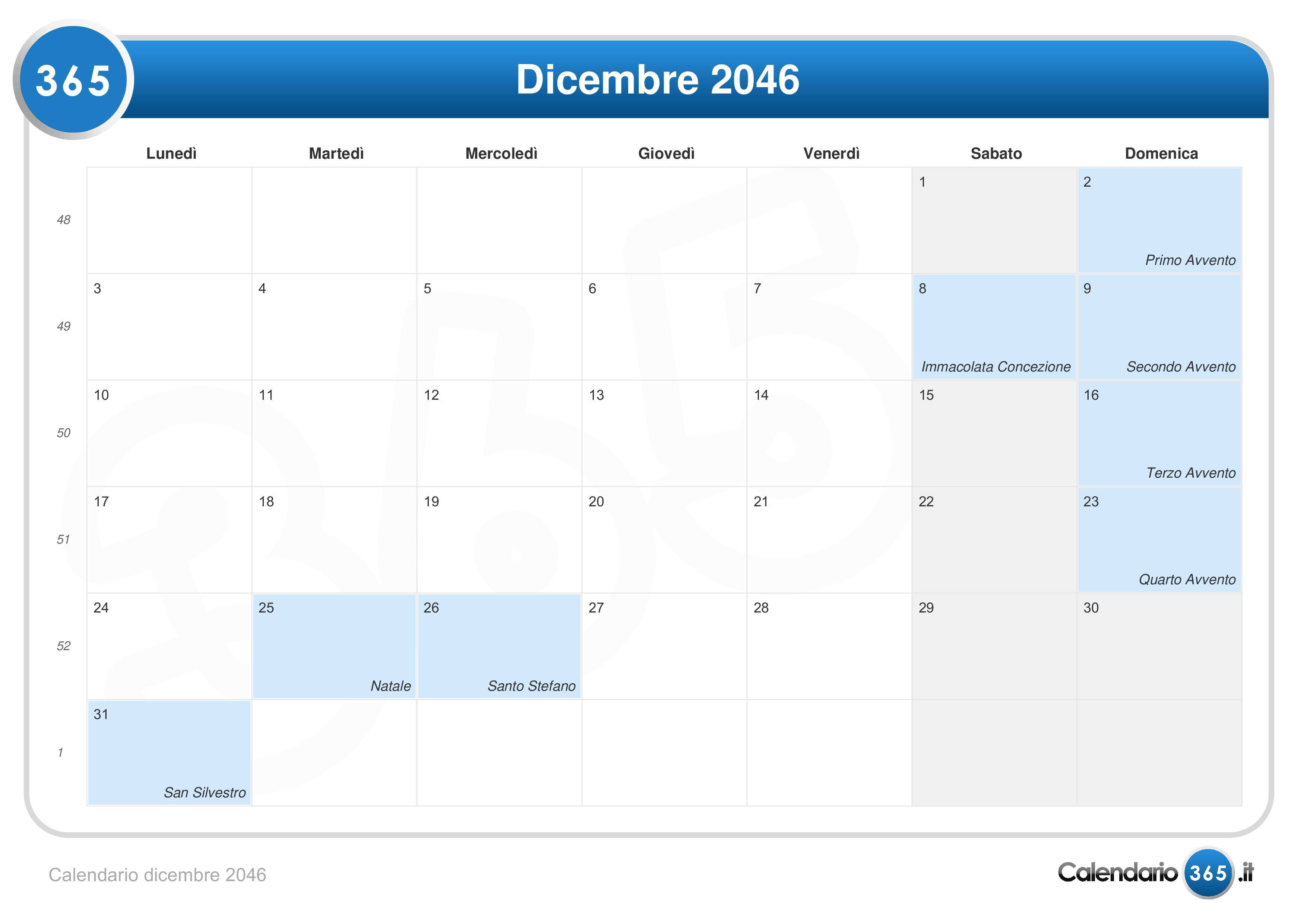 Calendario dicembre 2046 (Formato orizzontale)Vai al Calendario 2046.