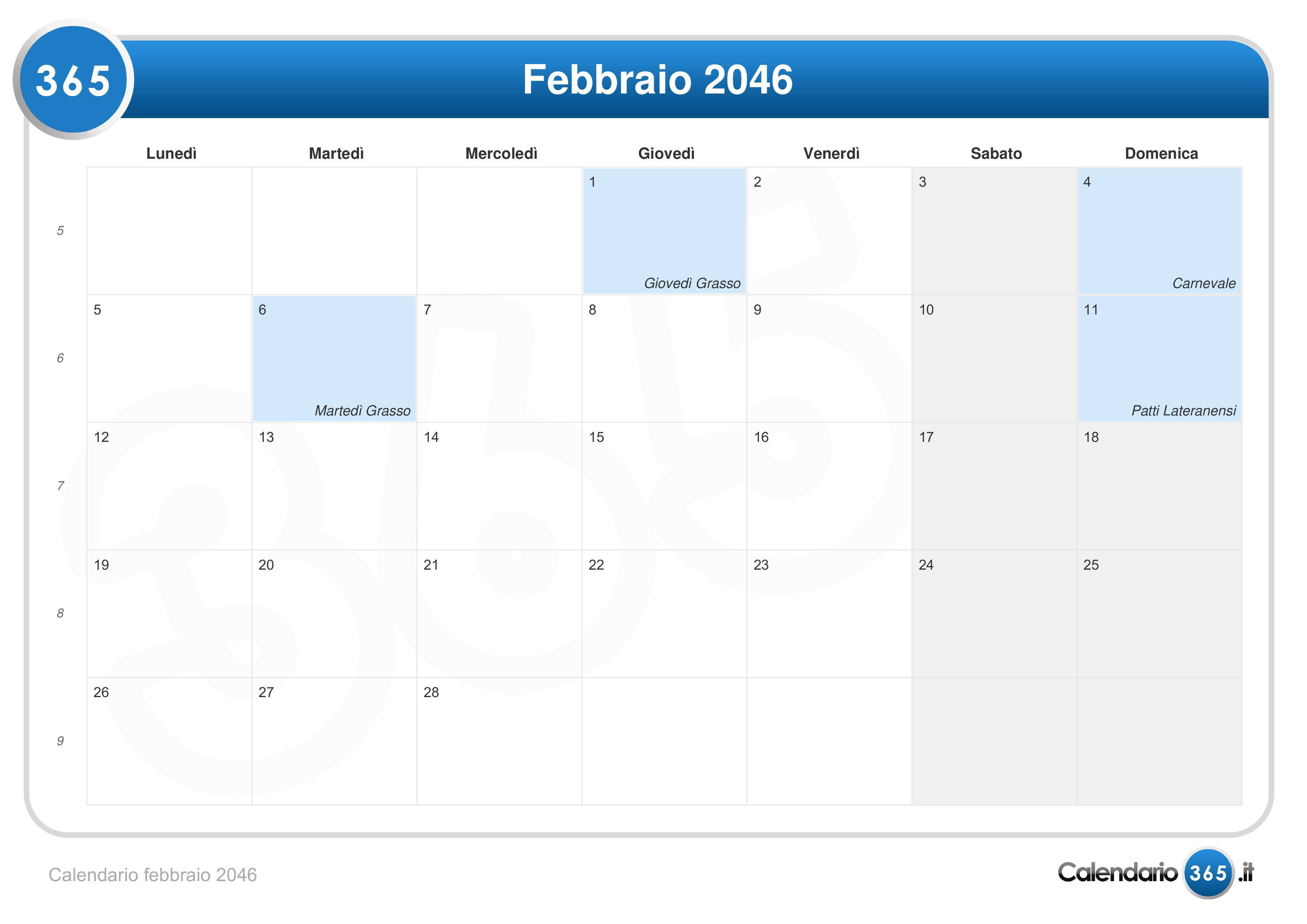 Calendario febbraio 2046 (Formato orizzontale)Vai al Calendario 2046.