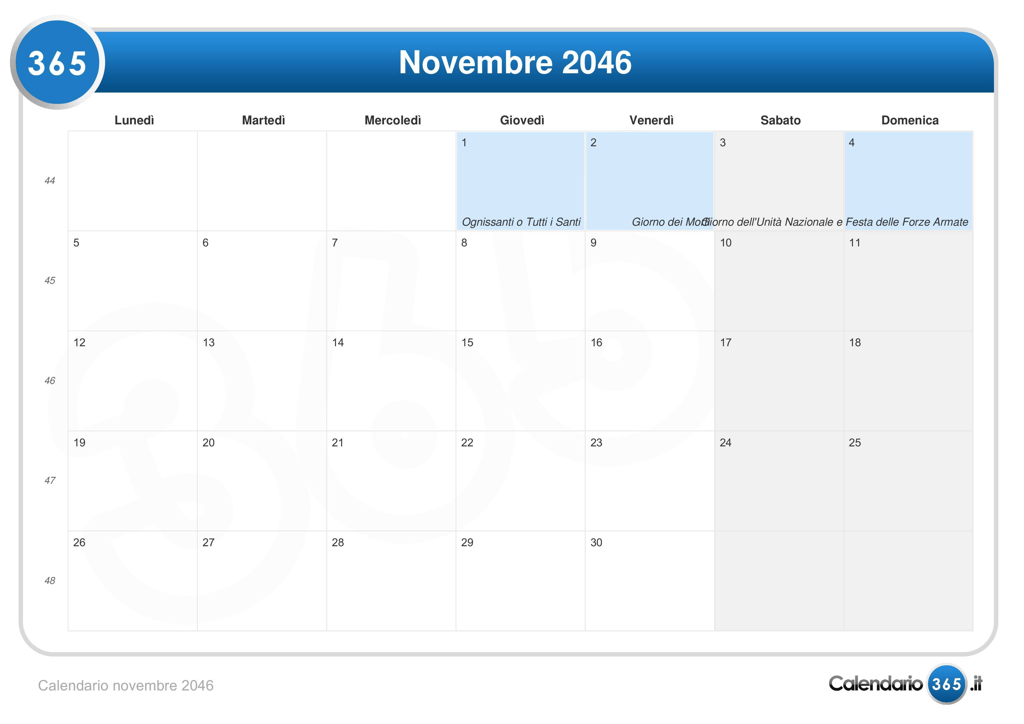 Calendario novembre 2046 (Formato orizzontale)Vai al Calendario 2046.